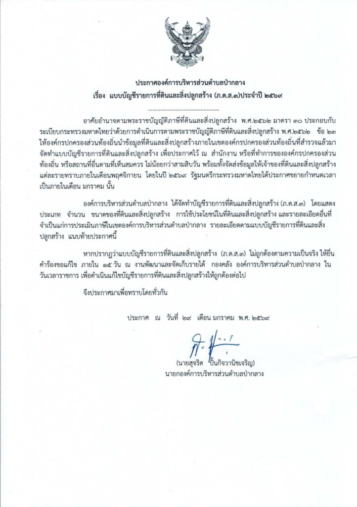ประกาศองค์การบริหารส่วนตำบลป่ากลาง เรื่อง แบบบัญชีรายการที่ดินและสิ่งปลูกสร้าง (ภ.ด.ส.3)ประจำปี 2569 ข่าวประชาสัมพันธ์ ประกาศ January 29, 2026January 29, 2026suriyanLeave a Comment on ประกาศองค์การบริหารส่วนตำบลป่ากลาง เรื่อง แบบบัญชีรายการที่ดินและสิ่งปลูกสร้าง (ภ.ด.ส.3)ประจำปี 2569 PDS03N-29-1-69Download